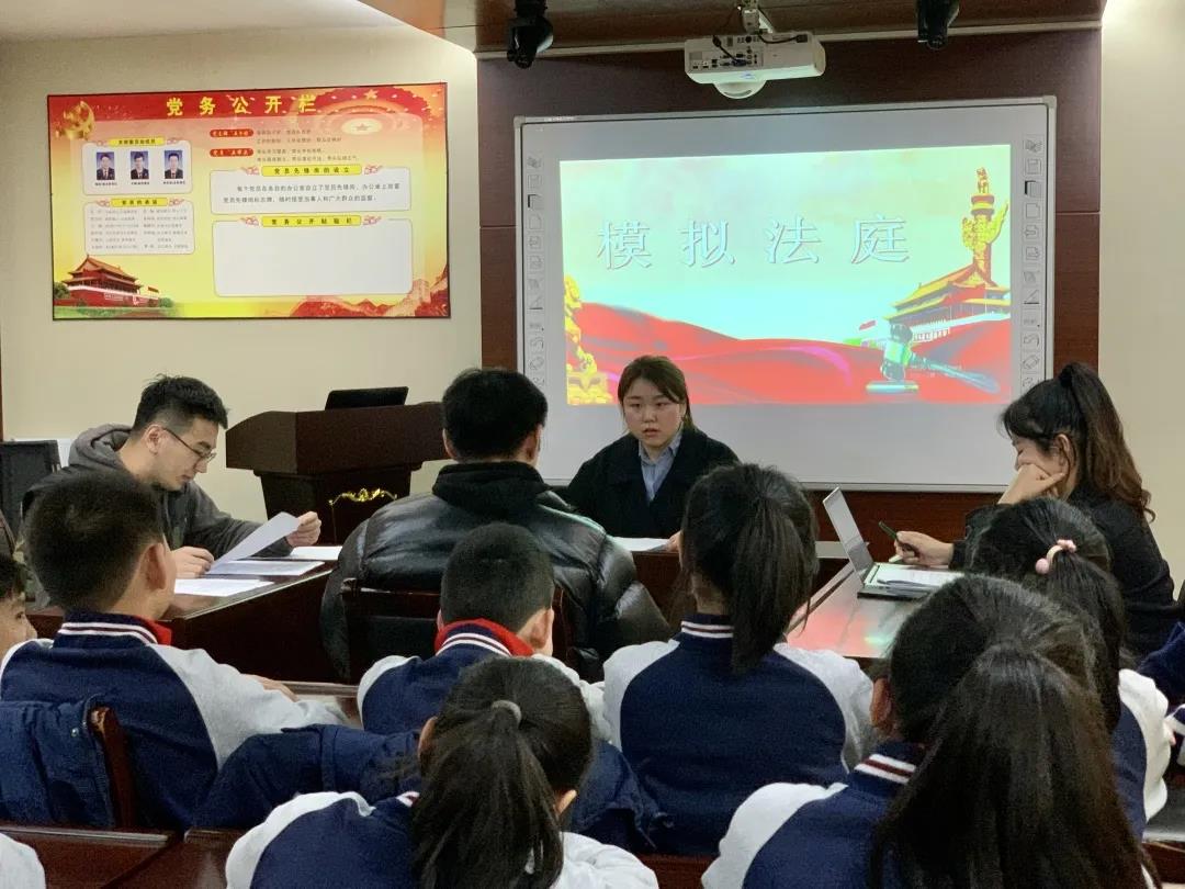 普法课堂结束后,由东瓯所青年律师们就某某贩毒罪一案组织模拟法庭活动,学生代表们旁听庭审观摩学习。