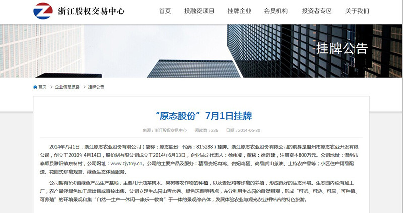 2014年7月1日,浙江原态农业股份有限公司(简称:原态股份,代码:815288)在浙江股权交易中心顺利挂牌。自4月份接受原态农业委托以来,浙江诚鼎律师事务所迅速组建以缪心毫律师、徐细智律师为核心的法律服务团队,服务内容包括:公司改制、规范公司治理、起草重要法律文件、出具法律意见书等等。