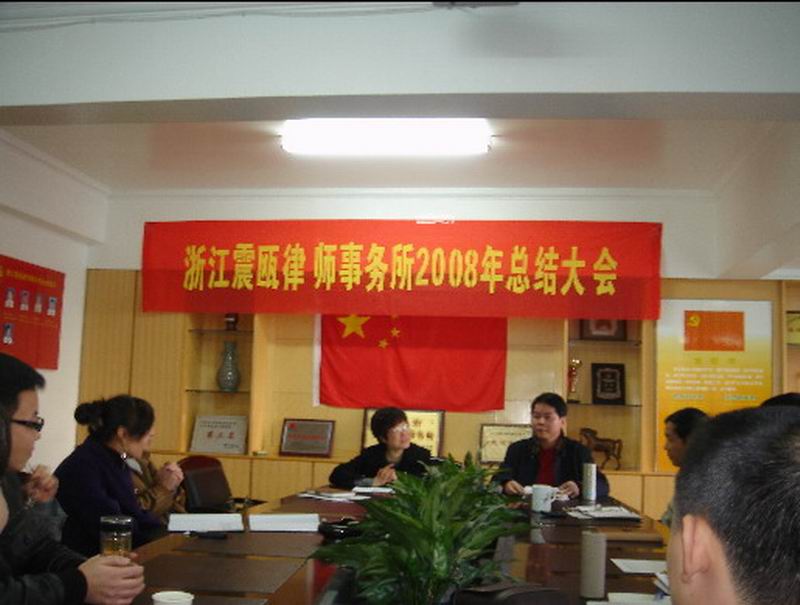 2009年1月18日下午,在震瓯所会议室召开了震瓯2008年年终总结大会。会上气氛热烈,徐志晗律师、蒲晶琰、郑飞凤分别获得了2008年度最佳进步奖、最佳新人奖、最佳行政奖。震瓯所主任叶连友律师、金爱娟律师等领导在会上发表了讲话。全所律师在对2008年进行总结的基础上,对如何更好的迎接新的2009年展开了一番振奋人心的讨论。