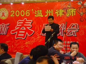 新的一年即将步入,我们将辞去鸡年、步入狗年。让我们在吉祥的氛围中去敲响新纪元的钟声,信步走进新的时代,让春风化雨滋润瓯江这片沃土,为构建温州社会更加公正、和谐承接起法律工作者应负起的历史责任!我坚信,2006年我市的律师工作将在市司法局、市律协的正确领导下,经过各位律师同仁的共同努力,温州律师法律服务工作一定能开创一个崭新的局面,活跃在经济社会更加广阔的舞台,为温州的法治和社会平安和谐作出更大的贡献!谢谢!