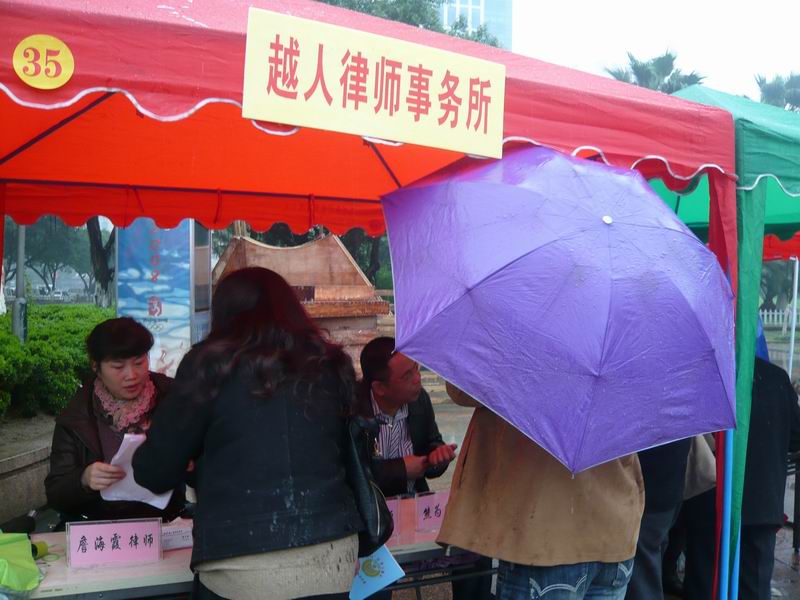 2010年3月15日上午,浙江越人律师事务所应温州市鹿城区消费者委员会邀请,由童洪锡主任律师带队,协同本所雷京卫、熊为维、詹海霞等律师冒雨到市区松台广场参加由鹿城消协主办的3.15大型广场活动。虽然天公不作美,下着大雨,但是咨询台前仍然站满了前来咨询的市民,从上午8点30分至11点30分,共接待市民法律咨询近40人次,本所律师对市民咨询的每一个法律问题均作了通之以情,晓知以法的耐心解答。本次活动取得良好的社会效果,深受广大市民欢迎。