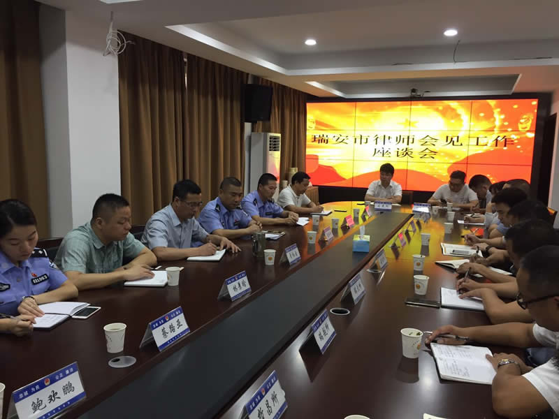 2017年9月15日上午,瑞安市司法局副局长章红云主持召开了瑞安市律师会见工作座谈会,全市13个律师事务所主任(或副主任)参加了会议,还特别邀请瑞安市看守所潘利明所长、瑞安市人民检察院监所科林景晗科长等相关单位科室负责人出席会议。