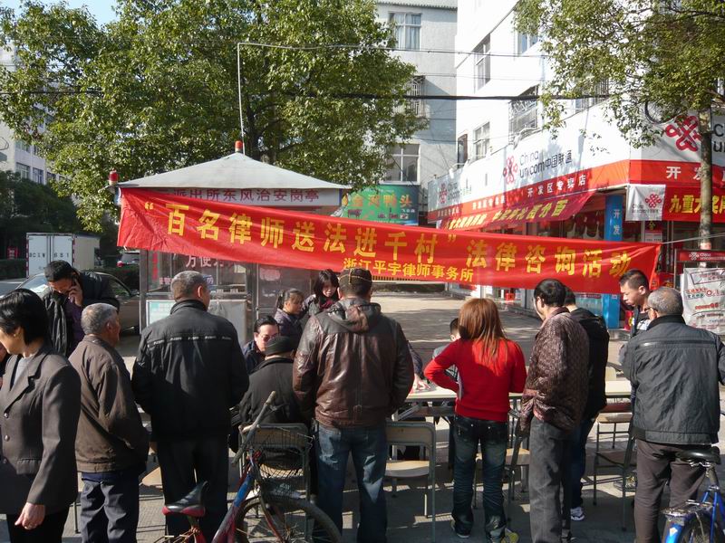 2010年12月22日上午,平宇所党支部组织部分党员律师及非党员律师,联合结对村瑞安市飞云镇龙头村党支部共同开展“百名律师进千村”法律服务活动。活动的主要内容有,为农村百姓群众赠送《村民委员会组织法》、《社会保险法》、《劳动合同法》、《物权法》等与百姓生活息息相关的法律书籍,现场为群众提供法律咨询。为了向更多的人提供服务,咨询现场设在飞云镇桥下路闹市区。参加这次活动的人员主要有我所主任童平宇律师、党支部书记胡钢律师、龙头村支部书记李育林、飞云办事处主要负责人等同志。龙头村支部为这次活动提供了很好的后勤服务。活动现场一摆开,就有很多的群众来咨询有关离退休、工伤、房屋买卖等百姓平常生活中遇到的常见法律问题,各律师为他们一一作了认真的解答;近百本法律书籍一会儿功夫即赠送完毕,咨询场面非常热烈,整个活动持续到中午11点30分才结束。