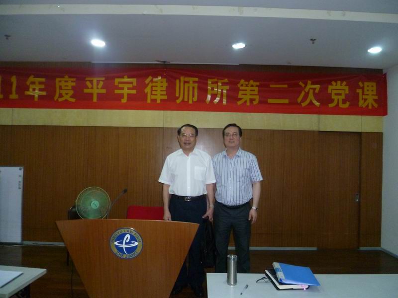 为庆祝中国共产党九十华诞,2011年6月29日晚,平宇所诚邀原温州市宣传部常务副部长、温州市非公经济和新社会组织党务工作者协会会长、北京师范大学教授林可夫同志,为平宇所及平阳分所全体人员上党课。在授课中,林可夫同志生动讲述了中国共产党的发展历程,深刻论述了中国共产党解放思想,实事求是,与时俱进的伟大生命力,阐明了只有中国共产党才能救中国,只有中国共产党才能带领全国人民实现民族复兴的道理。林可夫同志的讲课语言生动,深入浅出,有很高的理论素养,给全所同志留下了非常深刻的印象,使大家受到一次学党史、感党恩、跟党走的教育。