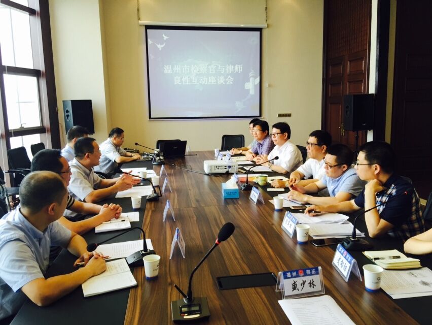 6月17日上午,温州市检察官与律师良性互动座谈会在市律协新会议室召开。市检察院副检察长王美鹏、市检察院公诉处、未成年人检察处等处室负责同志,市律协会长周光、市司法局律管处长、市律协秘书长袁旭清和部分律师参加了座谈会。