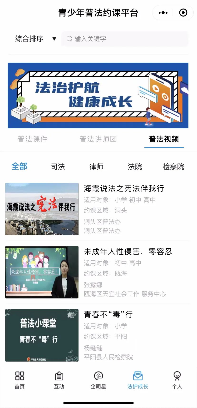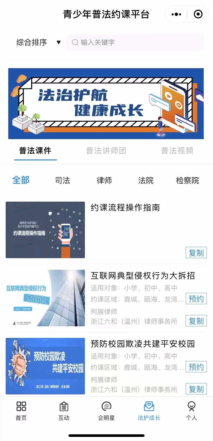 温州市青少年普法数字约课平台由市普法办联合市教育局、市法院、市检察院、团市委等单位共同打造,采用线上数字化订单式架构,提供在线约课功能,满足解决了全市各大中小学亟需优质普法师资和普法课程的迫切需求。