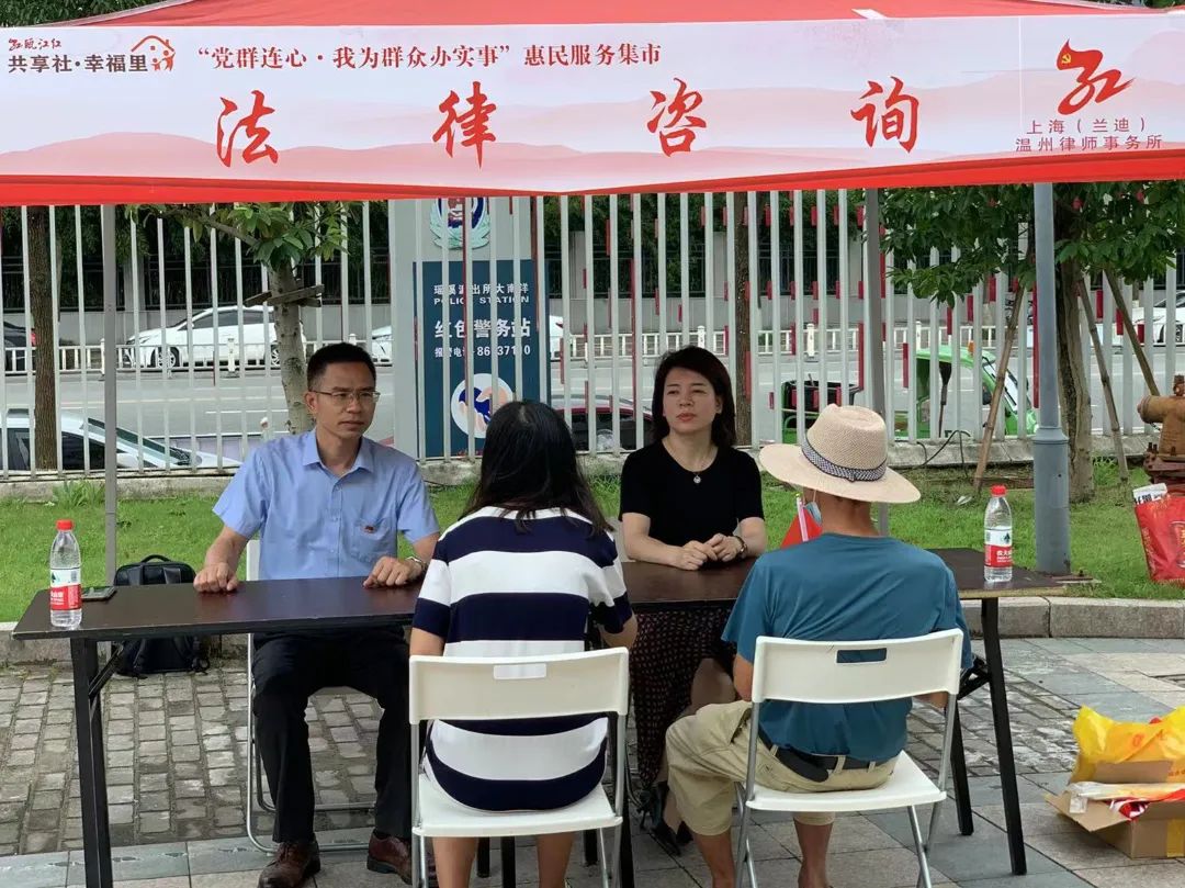 2022年是中国共产党成立101周年,是党的二十大召开之年。为喜迎党的二十大胜利召开,持续深入贯彻省、市党代会精神,6月30日—7月1日,兰迪(温州)所主任黄润生带队,律师陈秋夏、厉武、王秋红一行参加“党群连心·我为群众办实事”惠民服务集市,为社区居民们提供公益法律咨询服务。