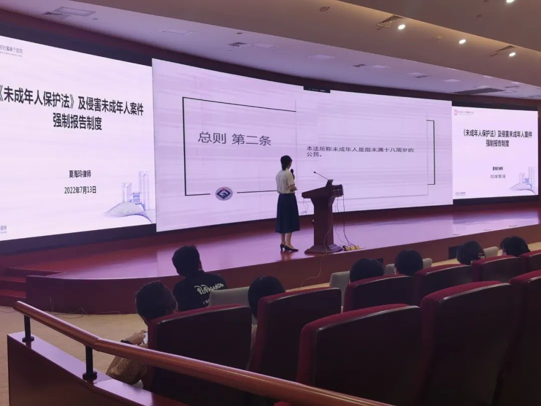 2022年7月13日下午,震瓯所合伙人夏海玲律师受邀到温州康宁医院股份有限公司为其开展《侵害未成年案件强制报告制度》专题演讲。温州康宁医院股份有限公司管理人员和职工参与本次学习。