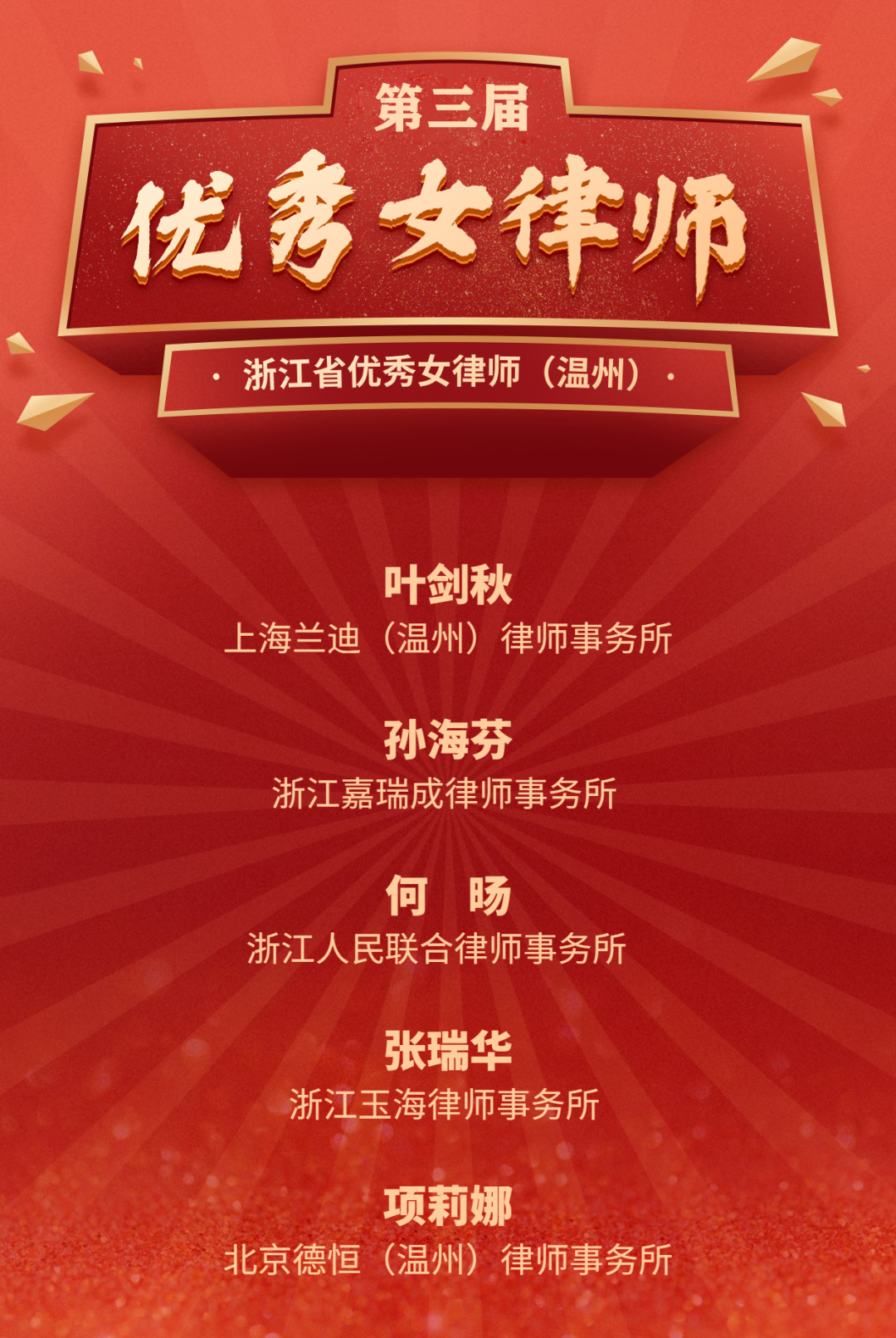 为充分发挥优秀女律师与青年律师的模范引领作用,进一步提升全省女律师、青年律师的职业道德素养和专业服务能力,表彰先进、树立楷模。省律协组织开展了第三届“浙江省优秀女律师”及第四届“浙江省优秀青年律师”评选活动。我市5名律师获“浙江省优秀女律师”荣誉称号,6名律师获“浙江省优秀青年律师”荣誉称号(名单附后)。