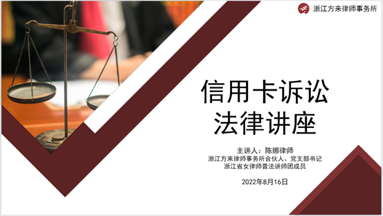 2022年8月16日下午,方来所陈娜律师受邀为中国民生银行股份有限公司信用卡中心温州分中心的法务、催收人员开展《信用卡诉讼法律讲座》。