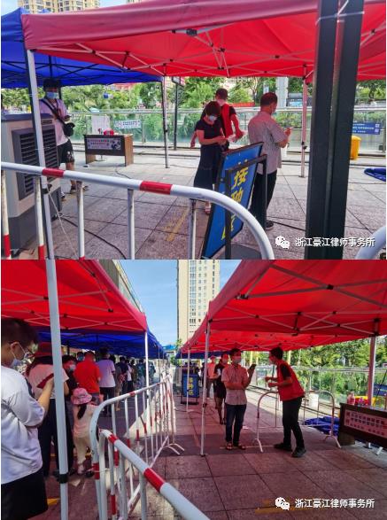 8月18日至19日、21日,在高温“烤”验下,浙江豪江律师事务所的抗疫志愿律师穿着红马甲,协助龙港市财富广场核酸采样点及龙港市至信大药房核酸采样点开展核酸采样工作。志愿律师们在现场维护现场秩序、引导市民有序排队、督促市民落实佩戴好口罩、亮码扫码、保持一米距离等防疫措施,保障核酸采样点工作有序进行。