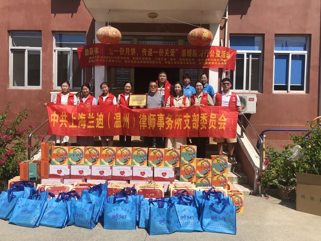 为弘扬中华民族尊老爱老的优良传统,切实展现情系孤寡,奉献爱心的精神,积极构建温馨、和谐社区,让老人们度过一个幸福温暖和谐的中秋佳节,97日,兰迪(温州)所党支部副书记金哲琼带领党员律师孙娉婷、专职律师许芝芝及实习律师张若婧前往丽岙侨心敬老院,参加由温州市社会组织发展和社区服务指导中心、瓯海区启晨社工服务中心发起送一份月饼,传递一份关爱第二期温暖瓯海行公益活动。