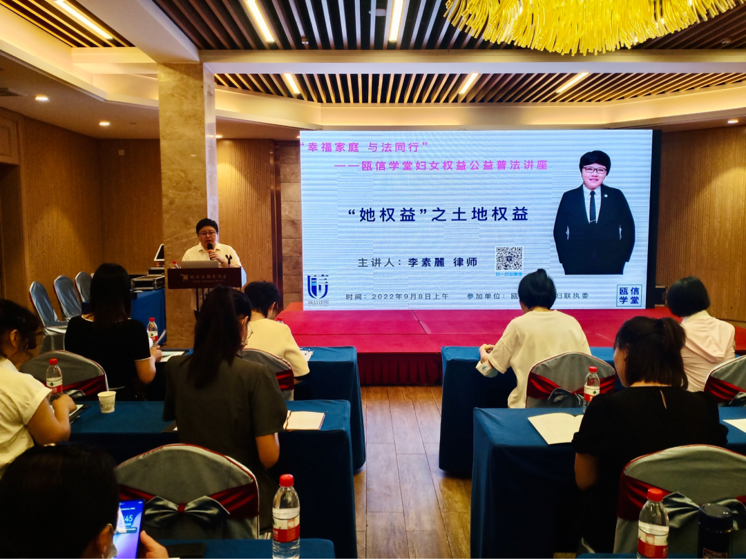 2022年9月8日上午,浙江瓯信律师事务所主任李素丽律师应邀开展温州海经区基层妇联领头雁素质提升培训,针对农村妇女土地权益保障问题,在瑶溪王朝大酒店开展瓯信学堂妇女权益公益普法讲座——“她权益”之土地权益 。