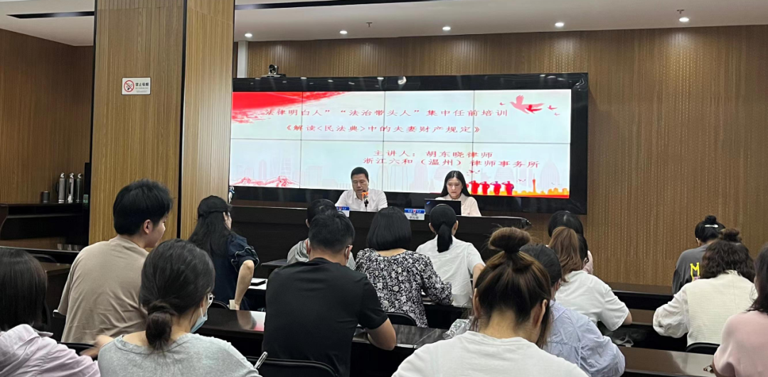 2022年9月6日,六和(温州)所胡东晓律师应鹿城区司法局邀请,为广化街道社区“法律明白人”“法治带头人”开展集中任前培训,培训主题是《解读〈民法典〉中的夫妻财产规定》。