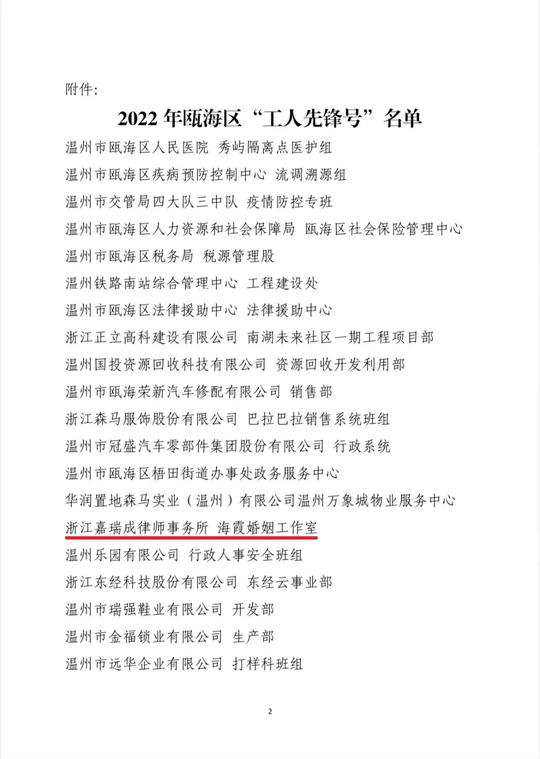 嘉瑞成所海霞婚姻工作室荣获瓯海区“工人先锋号”称号