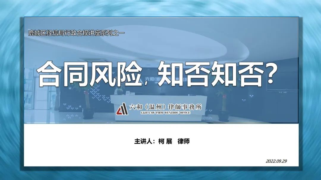 2022年9月29日,六和(温州)所副主任柯展律师接受鹿城区经济和信息化局邀请,为全局干部及人员开展了名为《合同风险,知否知否?》的行政合规法律讲座。