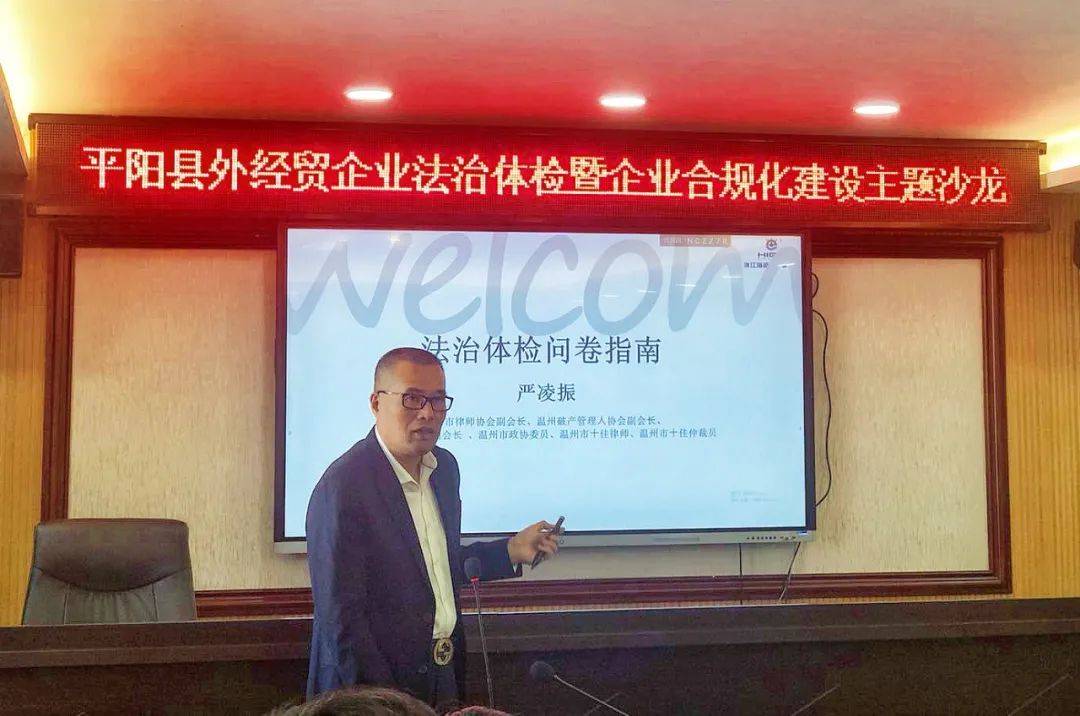 主题沙龙由平阳县商务局苏立坤局长主持,市商务局黄永胜副局长对此次法治体检工作作出了情况说明,指出此次调查工作旨在了解各企业的法律体系健全程度,发现对外贸易过程中潜在的法律风险,并探索外经贸企业健康发展的法律服务模式。佩蒂动物营养科技股份有限公司、浙江豪中豪健康产品有限公司、温州益坤电气股份有限公司等共计14家平阳县的外经贸企业参加了本次主题沙龙。严凌振律师围绕法规政策宣讲、法治环境保障、公司治理结构、风险防范化解等四个方面,采取以案说法的方式,讲解了外经贸企业在对外贸易过程中会遇见的常见法律风险并提出了相应的风险防范建议,并与各企业代表就企业对外贸易过程中遇到的法律问题进行了深入探讨并作出了现场解答。最后,严凌振律师及李彬蔚律师辅导各企业代表填写了外经贸企业合规化法治体检调查问卷,以便后续提供更有针对性的高质量的法律服务,圆满完成了此次法治体检与主题沙龙活动。