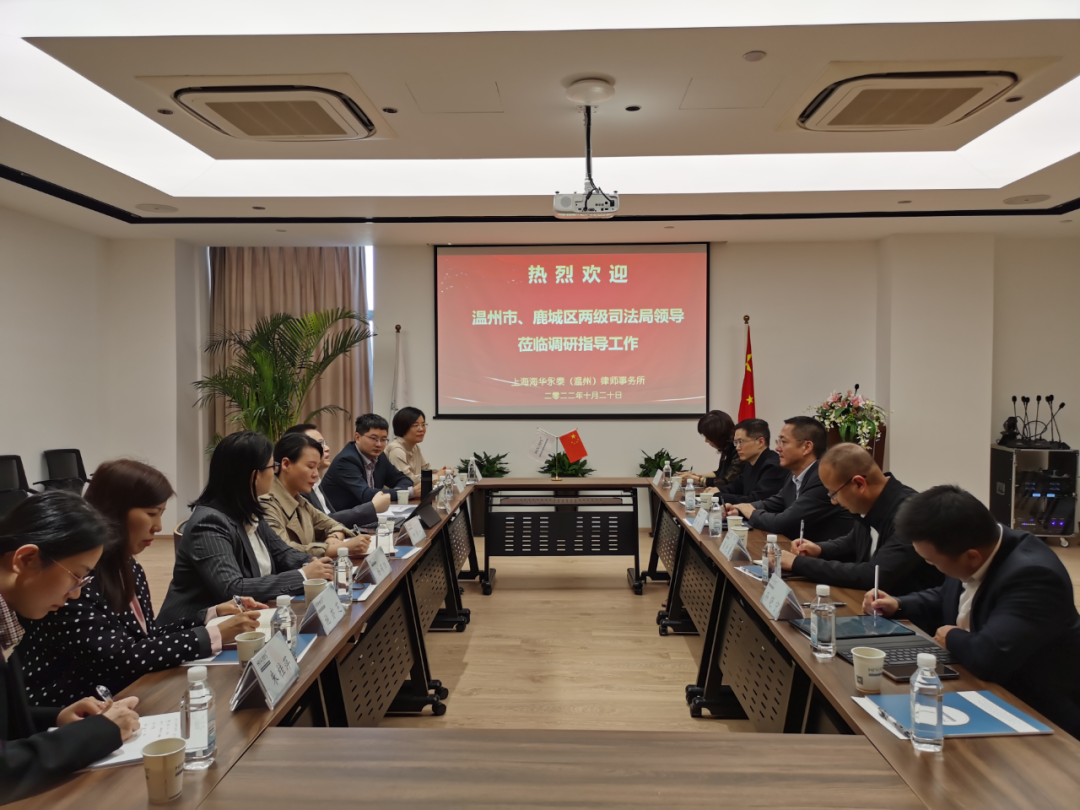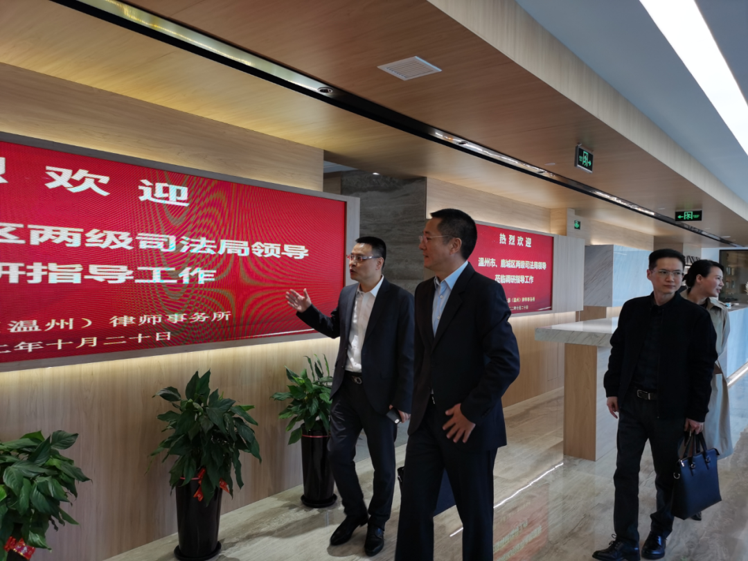 2022年10月20日,温州市司法局党委委员、副局长、市律师行业党委书记林向光、市司法局律工处处长陈先豪、温州市律协副秘书长孙晓宁一行莅临海华永泰(温州)所督导除险保安工作,鹿城区司法局副局长周密等陪同。