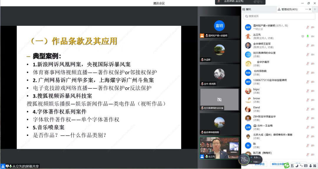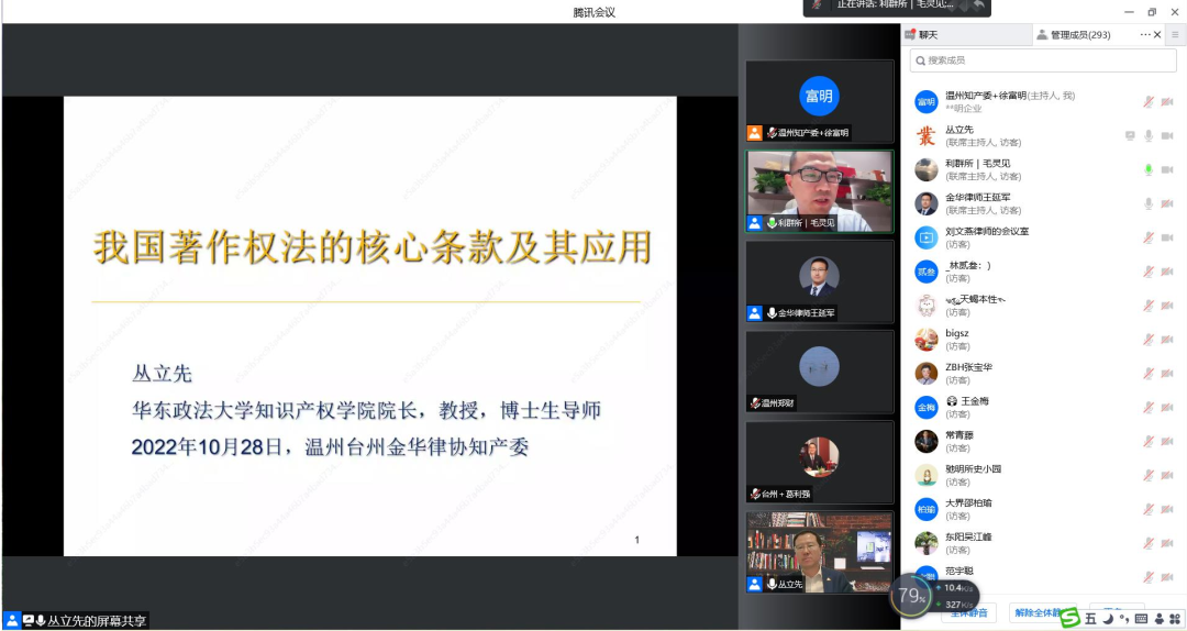 继上半年专利板块培训按期精彩完成以后,为回应三地律师对知识产权学习的热情,著作权版块的培训如期举行。2022年10月28日,著作权版块第一讲“我国著作权法的核心条款及其应用”专题讲座通过在线直播的方式举行。本次讲座邀请了华东政法大学知识产权学院院长、教授、博士生导师、武汉大学法学博士、中南财经政法大学法学博士后、教育部新世纪优秀人才、全国知识产权领军人才、国家知识产权专家库专家丛立先老师主讲,温州、台州、金华三地市律师共计500多人次参加培训。