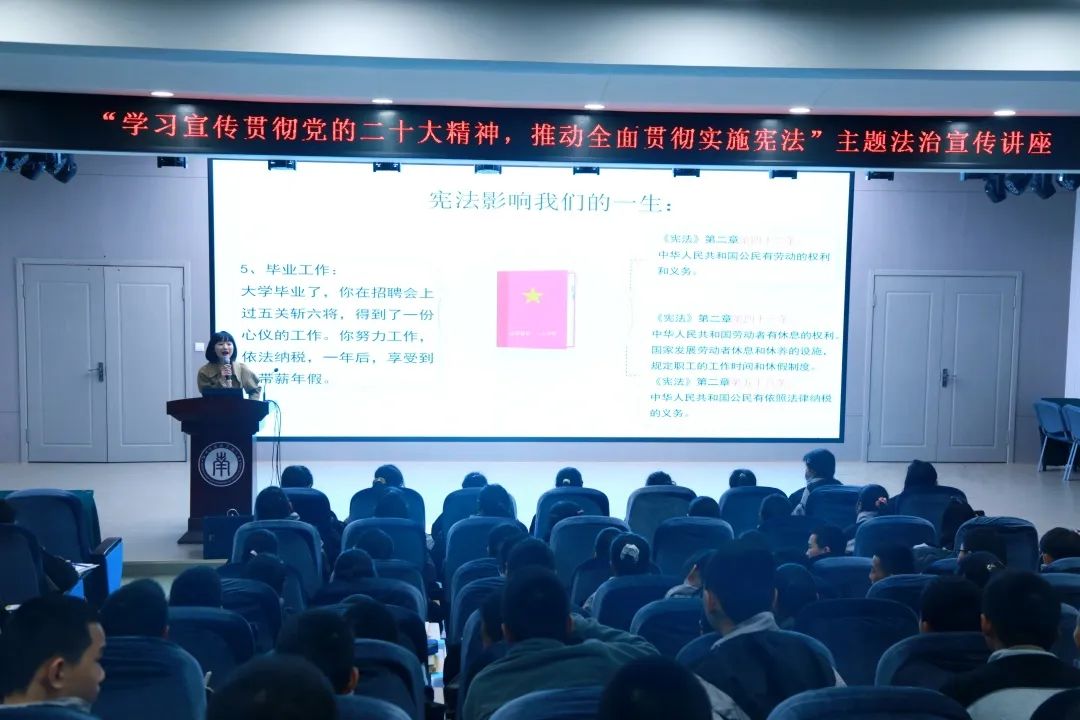 周瑜律师结合身边案例,分别从国家宪法日介绍、什么是宪法、宪法与你的一生、宪法相关案例分析等四个角度展开讲解,让学生了解设立国家宪法日的目的、宪法的由来、我与宪法的关系,引导学生自觉尊法守法,学会用法律来解决问题,维护自己的合法权益。本次讲座内容丰富,深入浅出,让现场师生受益匪浅。
