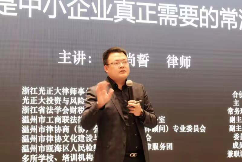 2019年11月23日,浙江光正大律师事务所合伙人谢尚誓律师受邀出席了由马鞍山市律师协会主办的第十五届马鞍山律师论坛-青年律师发展论坛,并分享了题为《什么才是中小企业真正需要的常年法律顾问服务》的主题演讲。