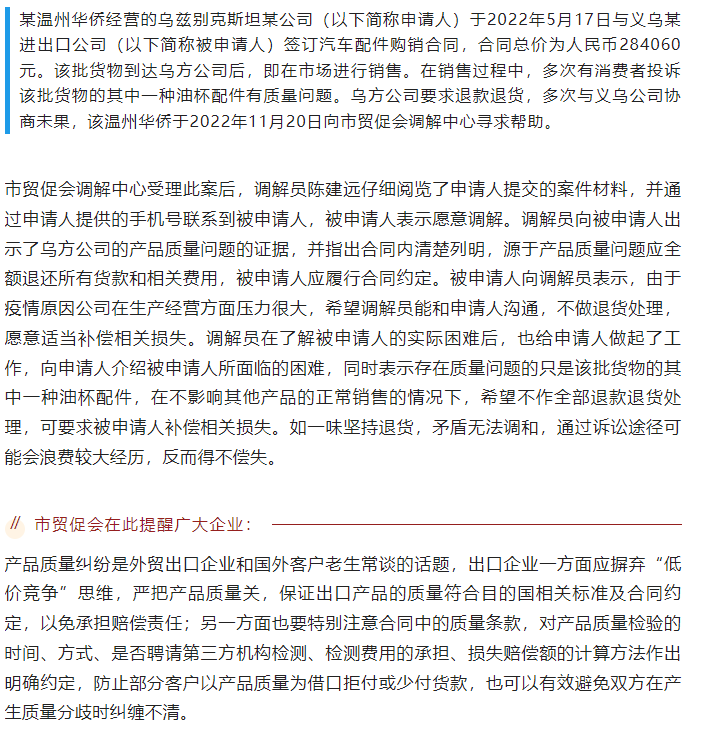市贸促会成功调解乌兹别克斯坦某公司与义乌某公司产品质量纠纷案