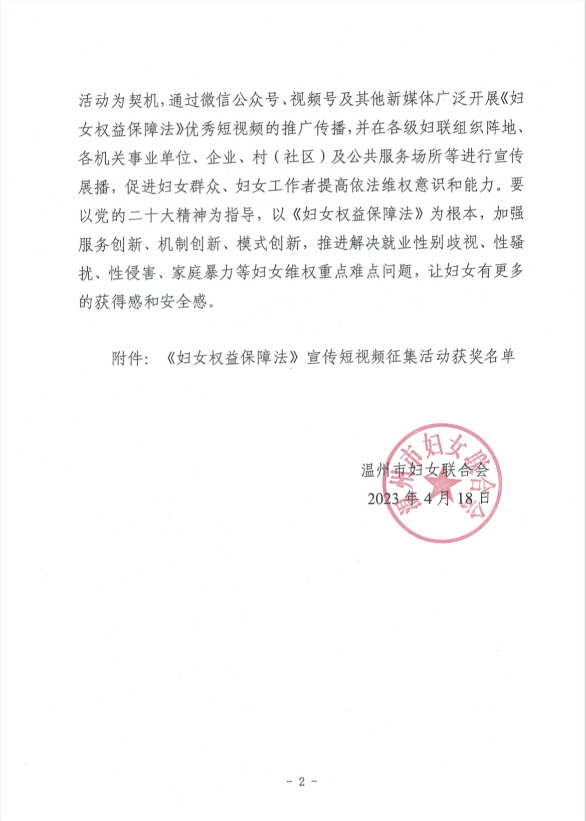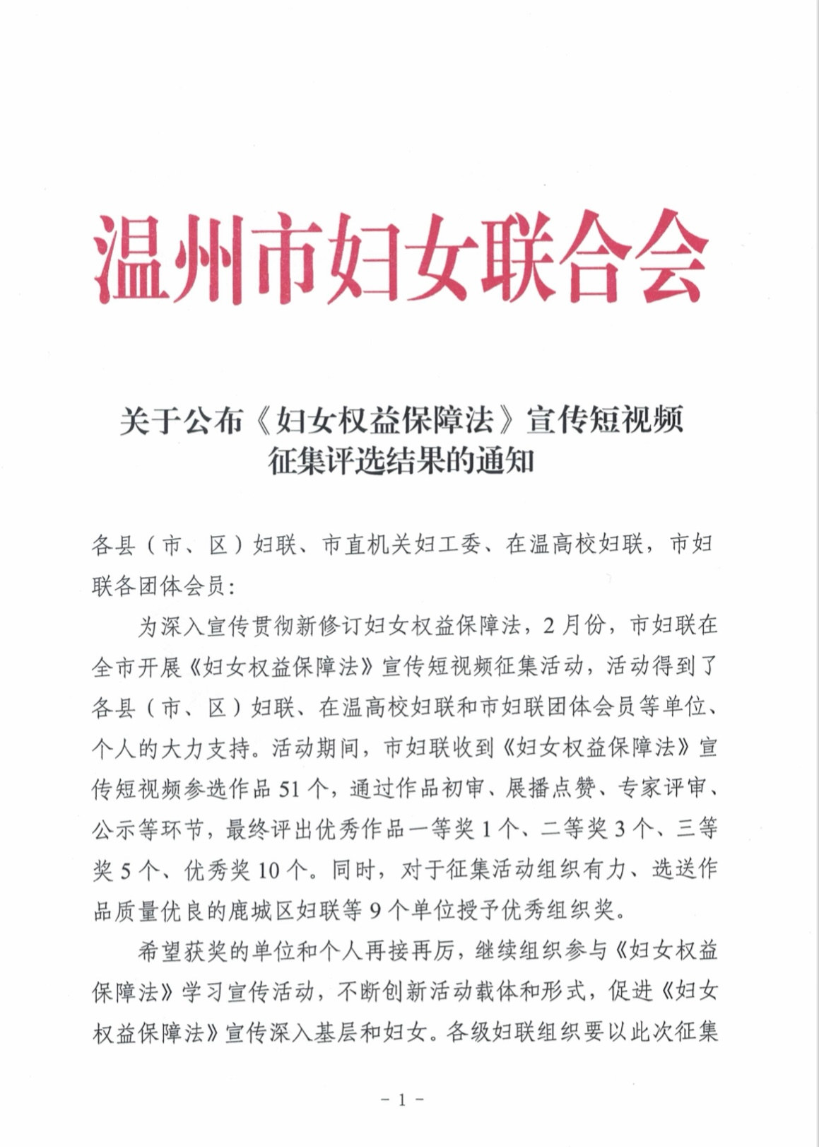 为深入学习宣传贯彻新修订的《中华人民共和国妇女权益保障法》,2023年2月,温州市妇联在全市范围内开展了普法宣传短视频征集活动。