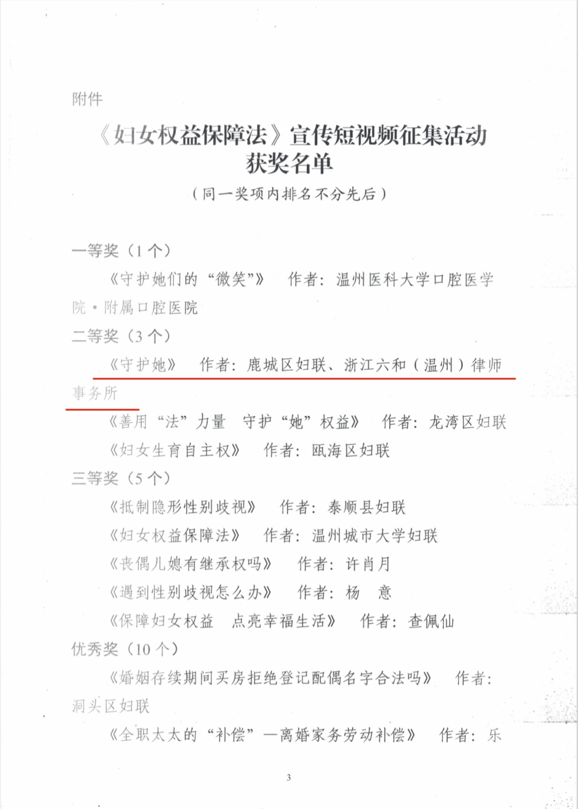 经作品初审、展播点赞、专家评审,选出9部优秀视频宣传作品成功入围,本所姜旭萍律师、刘安晴实习律师与鹿城区妇联联合报送的《守护她》荣获二等奖。