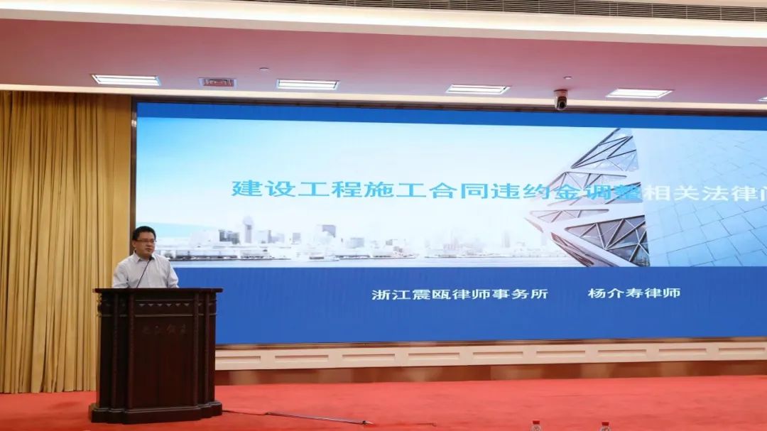 5月6日,由浙江省律师协会主办、全国律协建设工程专业委员会和浙江省律协建设工程专业委员会、房地产专业委员会众多资深律师参与的“当前形势下建设工程疑难复杂法律问题”研讨会在杭州举办,我所副主任、浙江省律师协会建设工程专业委员会副主任杨介寿律师在研讨会上作《建设工程施工合同违约金调整相关法律问题》交流演讲。