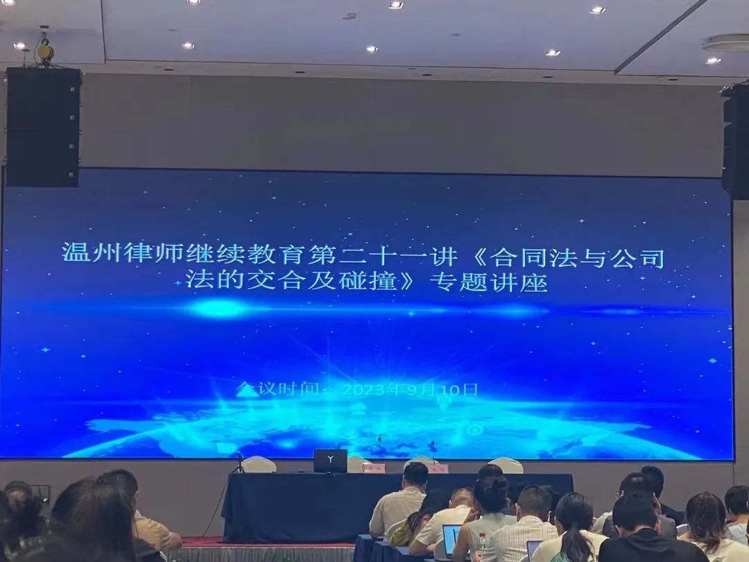 2023年9月10日,由温州市律师协会主办,温州市律师协会民商事专业委员会承办的2023年温州律师继续教育第二十一讲《合同法与公司法的交合及碰撞》专题讲座在温州大学城开元名庭酒店顺利召开。