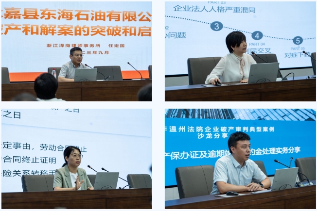 陈洁律师讲解了浙江美福食品有限公司、温州市美福餐饮有限公司合并破产清算案中有关企业法人人格混同及债权涉及刑民交叉等问题,并就上述问题的解决,提出了适用合并破产、刑民交叉协同处置等方法,实现破产法公平清偿价值,取得了良好的社会效果。