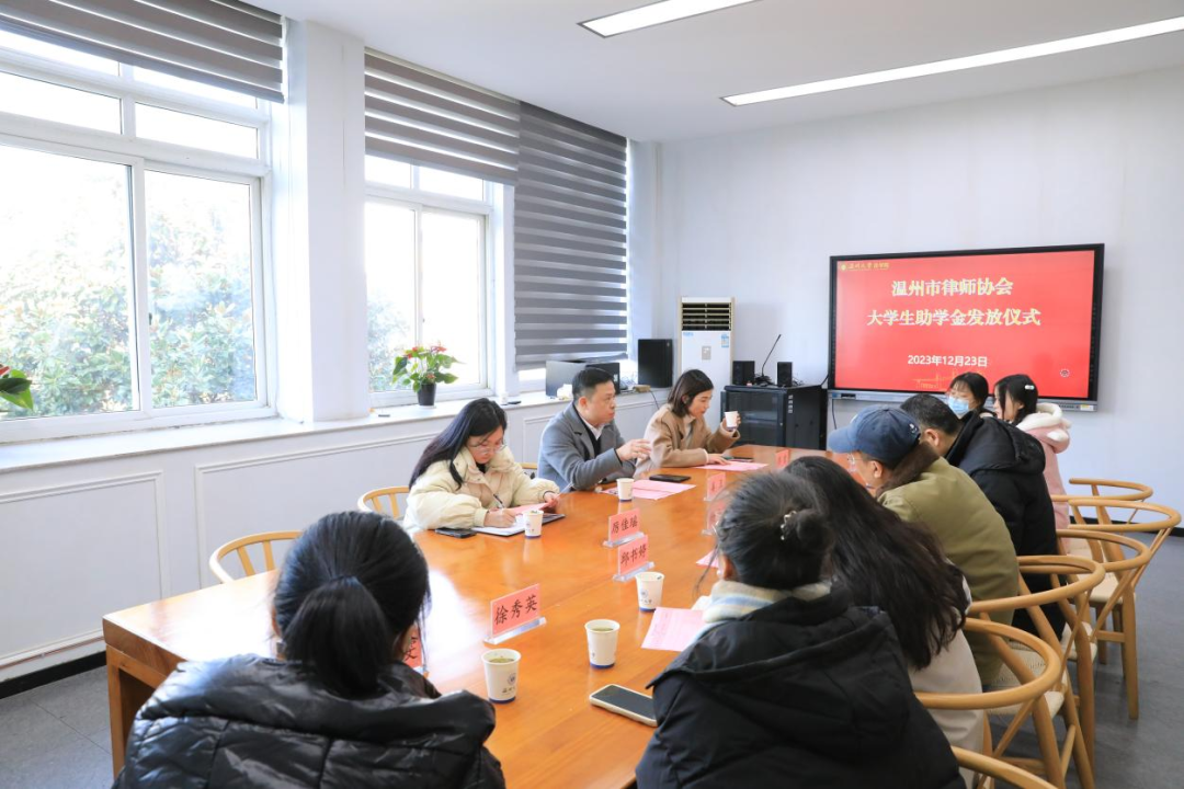 为更好培养法律专业人才,推进高素质法律人才队伍建设,近日,温州市律师协会副会长姜正等一行前往温州大学法学院开展爱心助学活动,温州大学法学院党委书记林钦、党委副书记杨振海、辅导员白昌科以及获得助学金的四名学生代表参加活动。