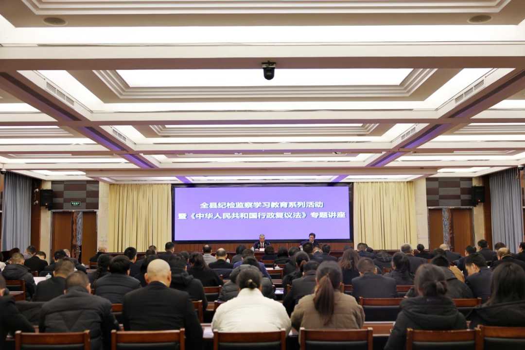 2023年12月25日晚,平阳县纪委监委举办全县纪检监察学习教育系列活动暨普法学法专题讲座,池方景主任受邀授课讲解新修订的《中华人民共和国行政复议法》。县委常委、县纪委书记、县监委主任朱园园及全县纪检监察干部和县委巡察干部共一百多人参加,县纪委常务副书记、县监委副主任王良洪主持本次讲座。