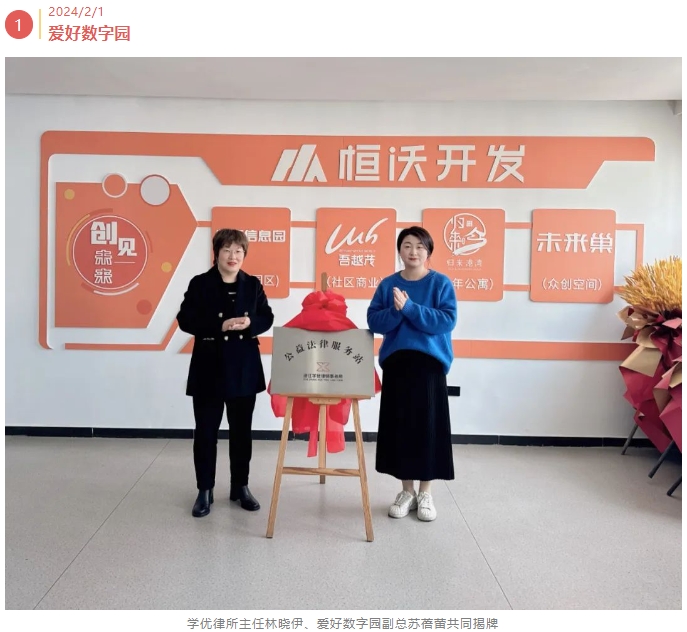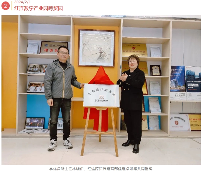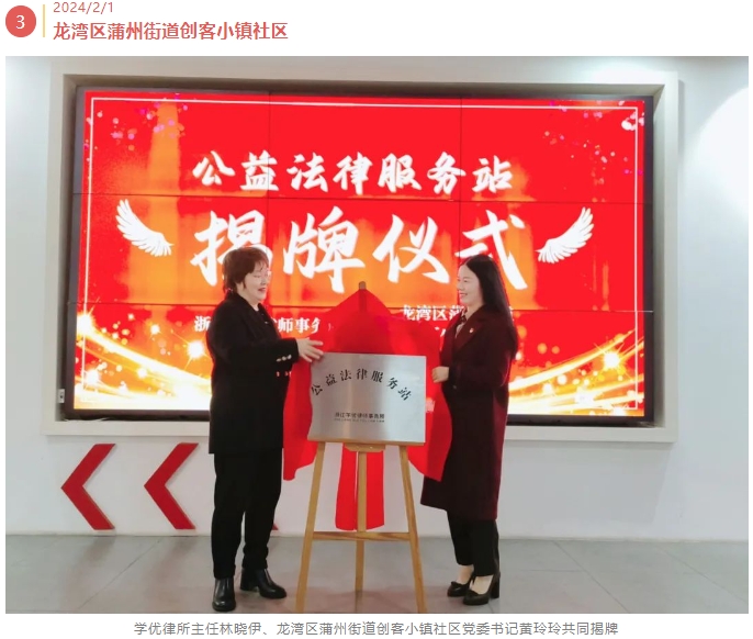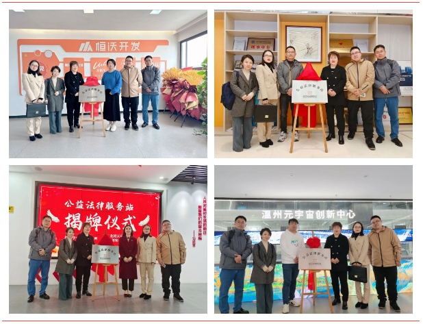 2月1日,浙江学优律师事务所公益法律服务站分别于爱好数字园、红连数字产业园跨贸园、龙湾区蒲州街道创客小镇社区、温州元宇宙创新中心正式揭牌设立。