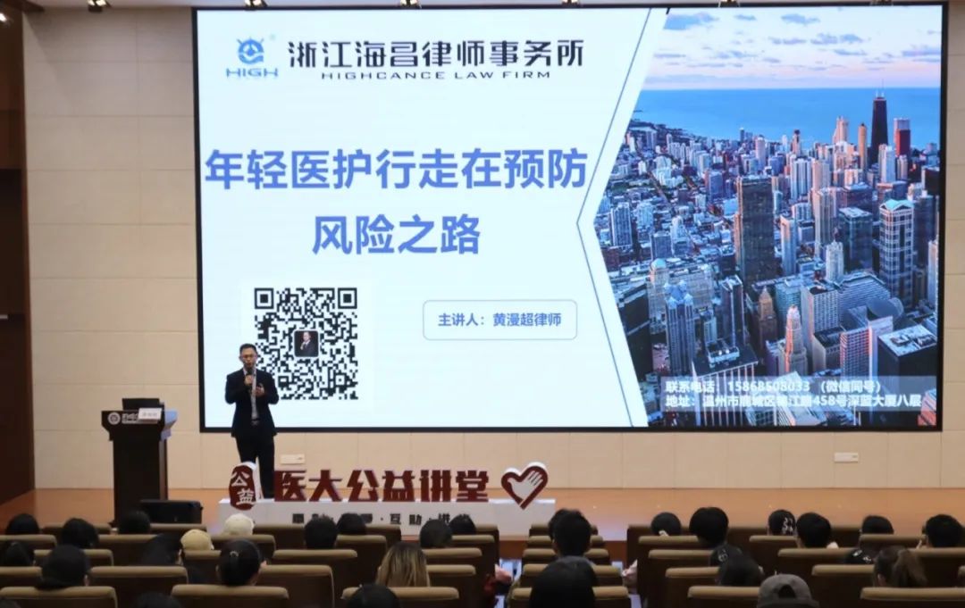 2024年3月22日下午,浙江海昌律师事务所黄漫超律师应温州医科大学的邀请,参与温州医科大第53期医大公益讲堂暨第二期“法务+”校园法治赋能计划,成功开展了题为“医学之光,慧心护航:年轻医护行走在预防风险之路”的普法讲座。本次讲座也是「律说漫谈」系列讲座第25期。
