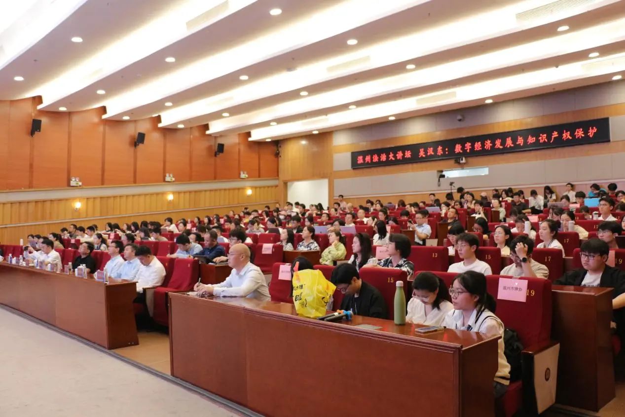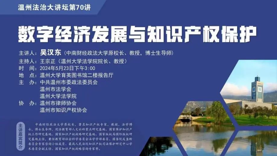 2024年5月23日,市委政法委、市法学会、温州大学法学院、市律师协会联合举办温州律师继续教育第八讲知识产权专题讲座暨温州法治大讲堂第70讲《数字经济发展与知识产权保护》专题讲座。本次讲座特邀中南财经政法大学原校长、教授、博士生导师吴汉东主讲。