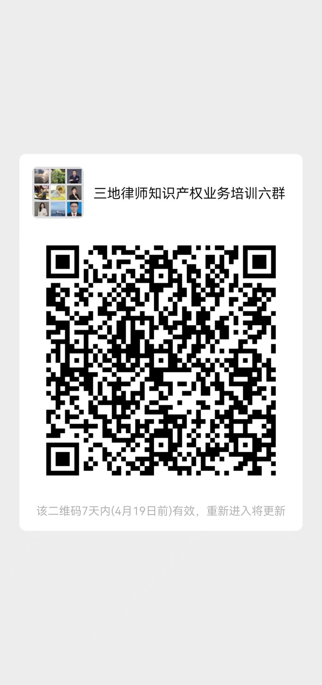 腾讯线上会议(温州市、台州市、金华市律师协会知识产权专业委员会、金华市律协婺城分会知识产权专业委员会全体委员请加微信一群,其他非知产委委员报名人员未曾加二群、三群、四群、五群的,可以直接扫码加六群,会议号将在会议开始前在微信群内发送,微信群二维码见附件)。