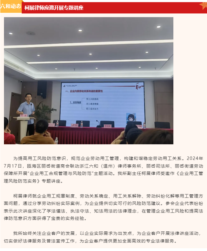 六和温州所柯展律师应邀为丽岙街道商会开展企业用工合规专题讲座