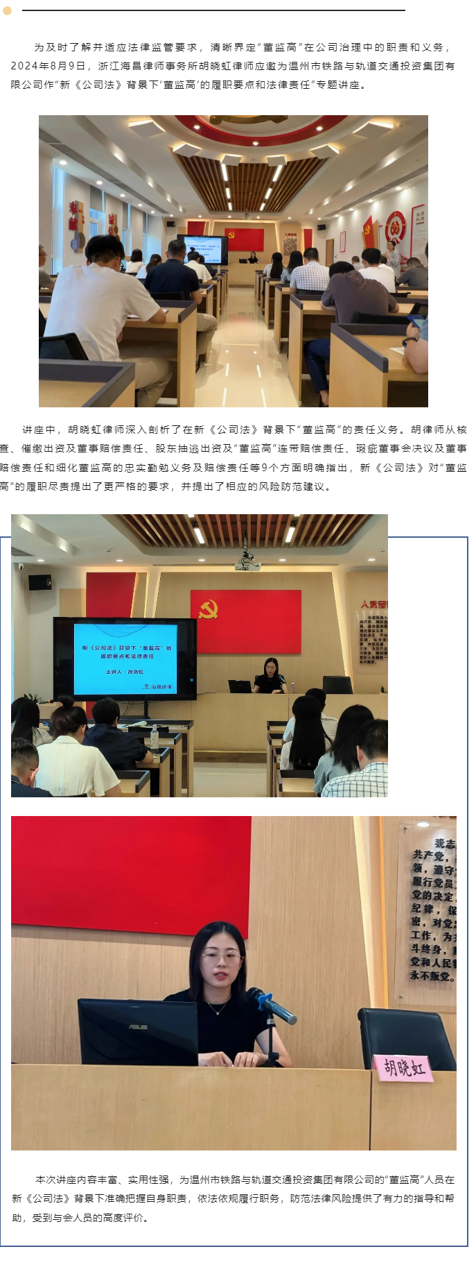 海昌所胡晓虹律师为温州市铁投集团作新《公司法》背景下“董监高”履职要点与法律责任讲座
