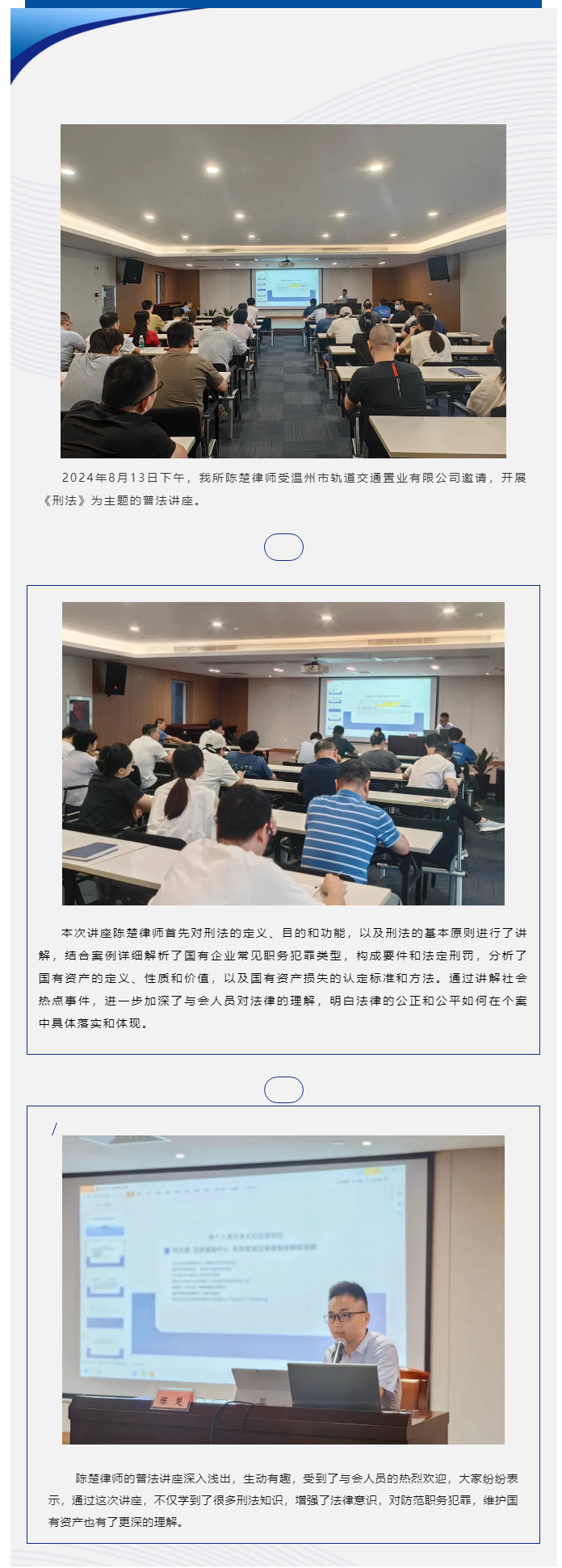 海昌所陈楚律师应邀为温州市轨道交通置业有限公司作《刑法》专题讲座