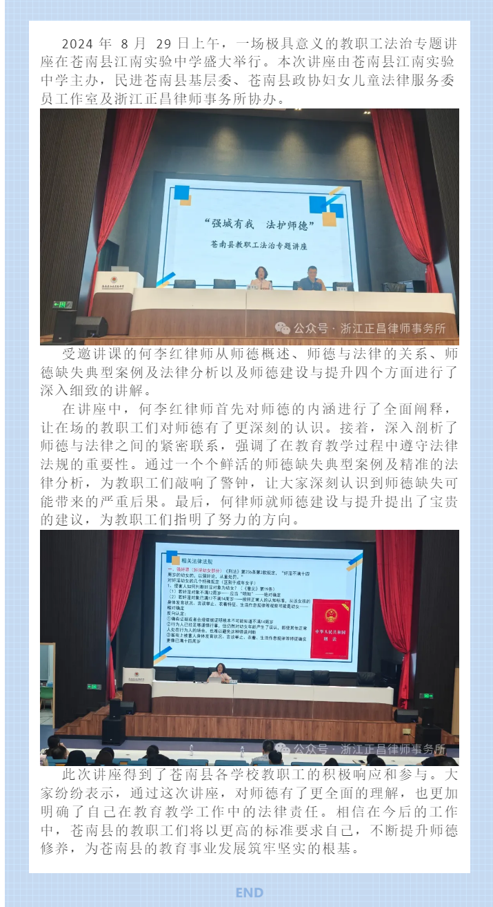“强城有我 法护师德”——正昌所律师受邀为苍南县教职工开展法治专题讲座