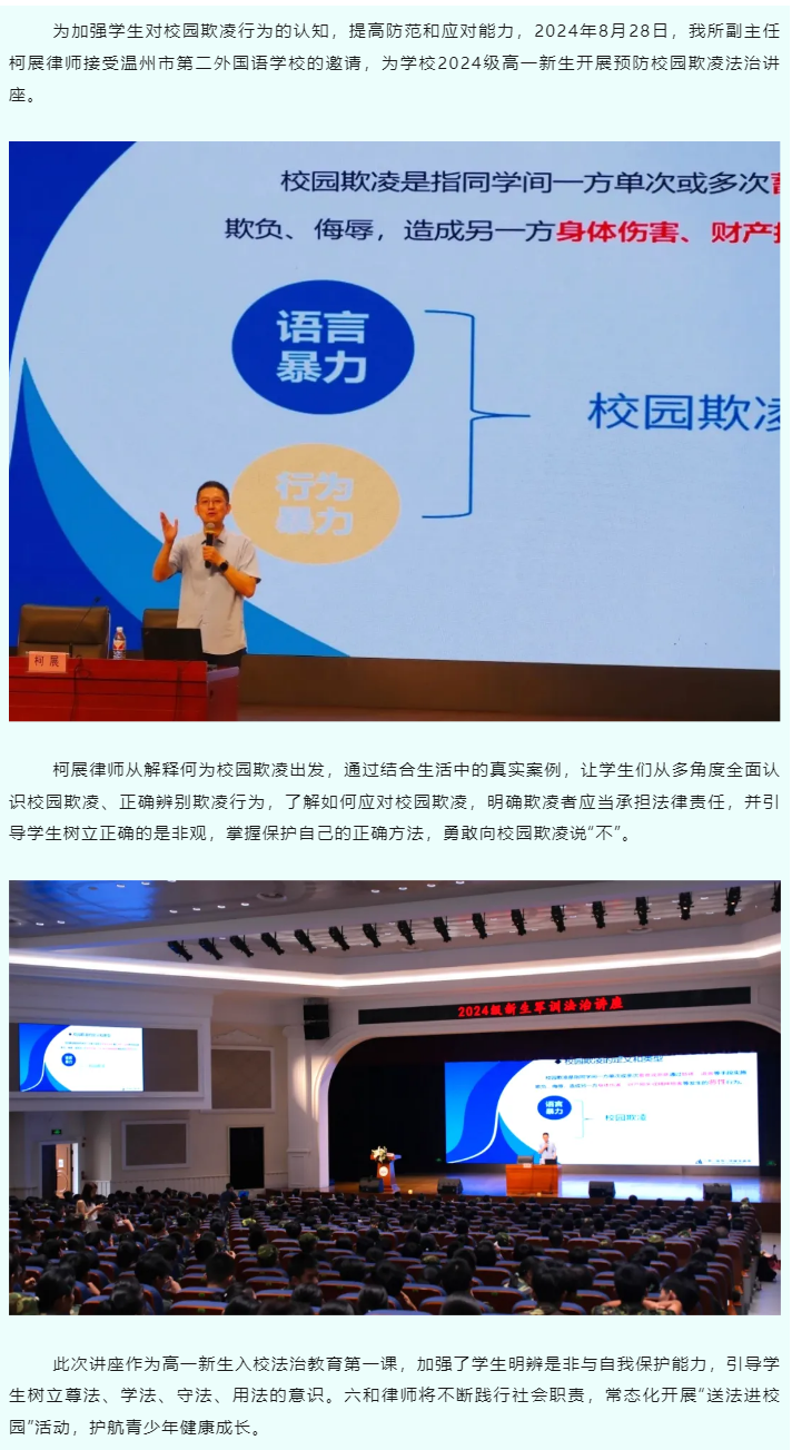 六和温州所柯展律师为温州市第二外国语学校高一新生开展校园普法讲座