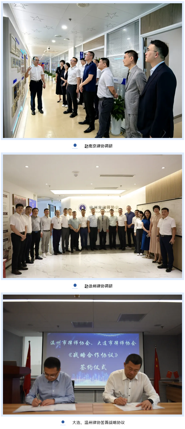 2024年8月27-30日,金疆会长带领温州律协考察团赴南京、徐州、大连三地考察,与三地律协就行业发展、协会工作、“产业链+法律服务”等工作进行了交流互动,并与大连律协签订战略合作协议,深化两地律师行业在人才培养、业务研讨、协作办案等领域的协作。
