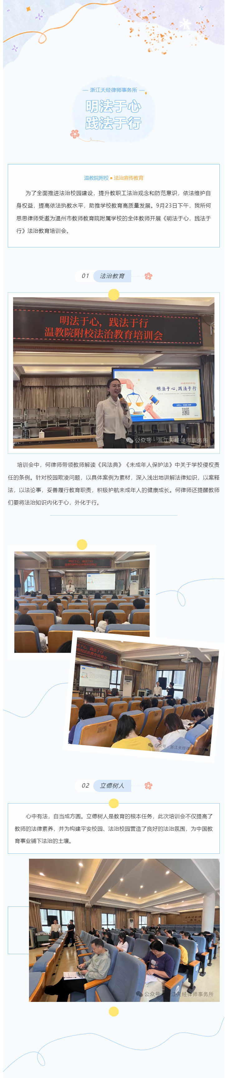 天经所何思思律师受邀为温州市教师教育院附属学校全体教师开展《明法于心,践法于行》法治教育培训会