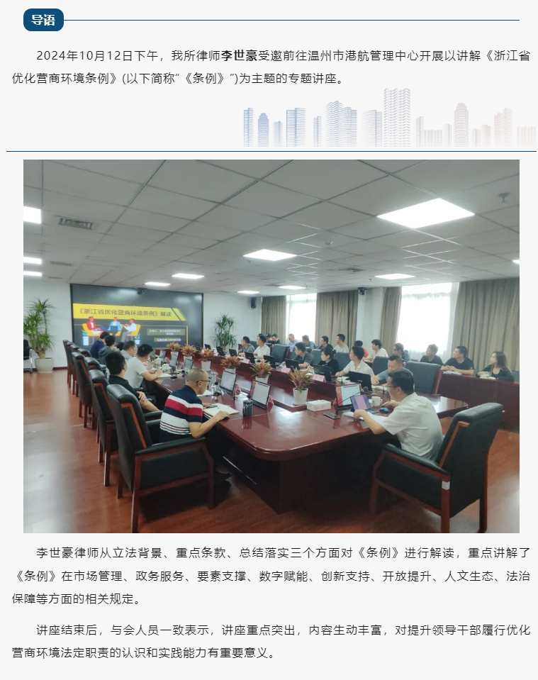震瓯所李世豪律师受邀为温州市港航管理中心开展讲解《浙江省优化营商环境条例》专题讲座