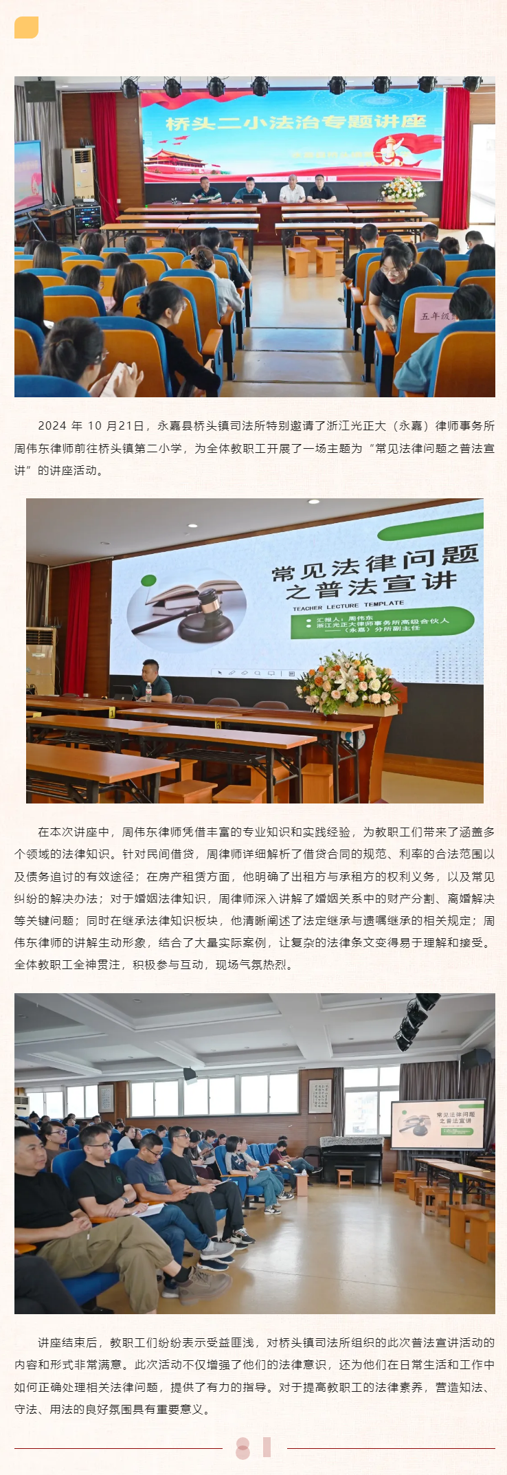 光正大永嘉所周伟东律师应邀为永嘉县桥头二小全体教职工开展“常见法律问题之普法宣讲”