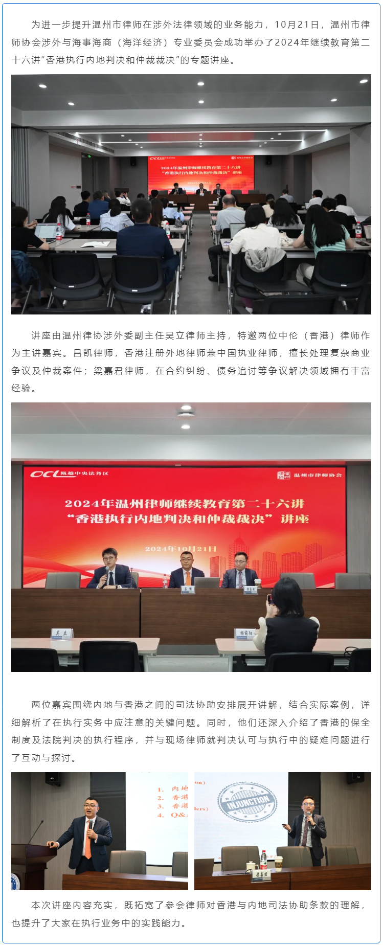 温州律协举办2024年继续教育第二十六讲“香港执行内地判决和仲裁裁决”专题讲座
