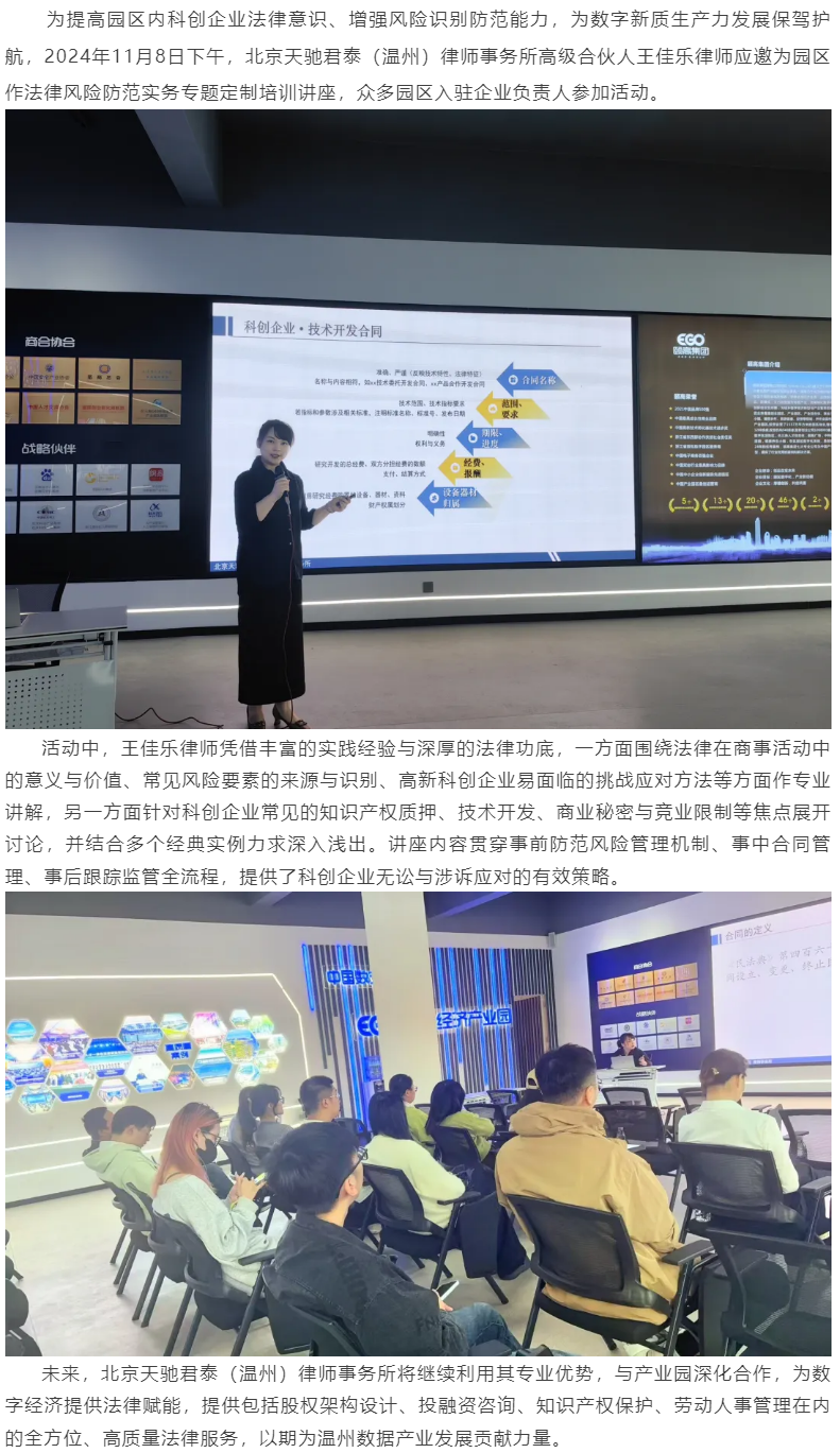 天驰君泰温州所王佳乐律师应邀为温州颐高数字经济产业园作法律风险防范专题培训讲座
