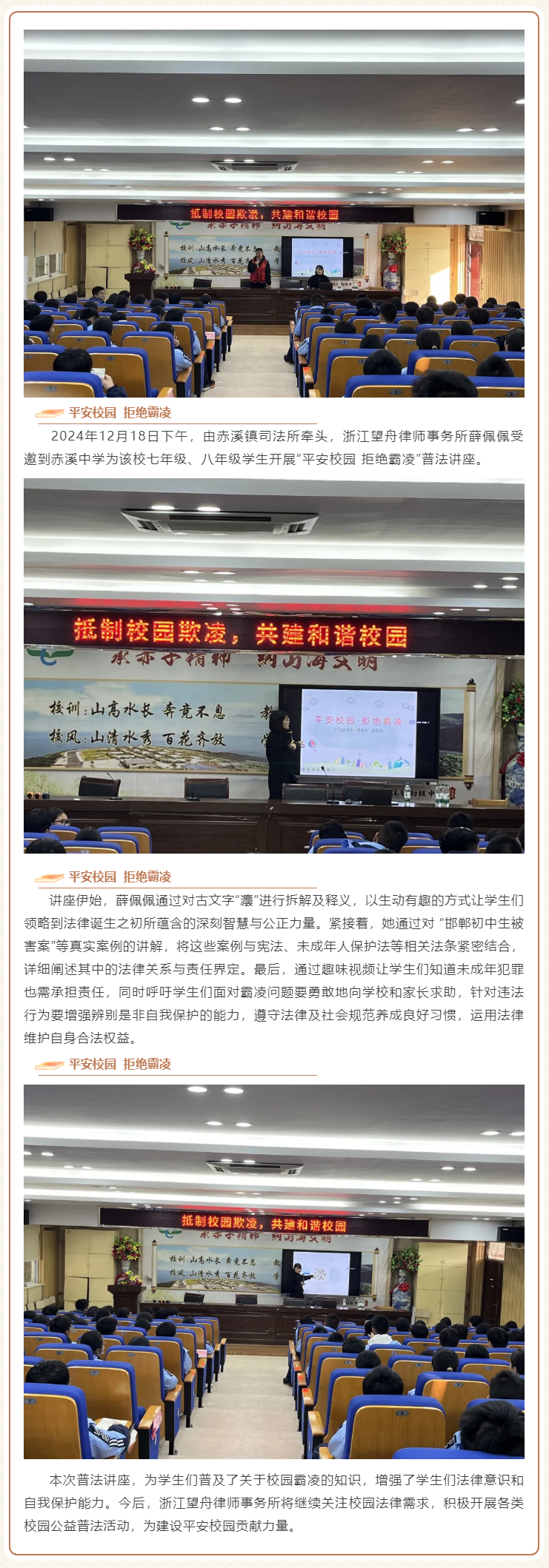 望舟所薛佩佩律师受邀到赤溪中学开展“平安校园 拒绝霸凌”普法讲座