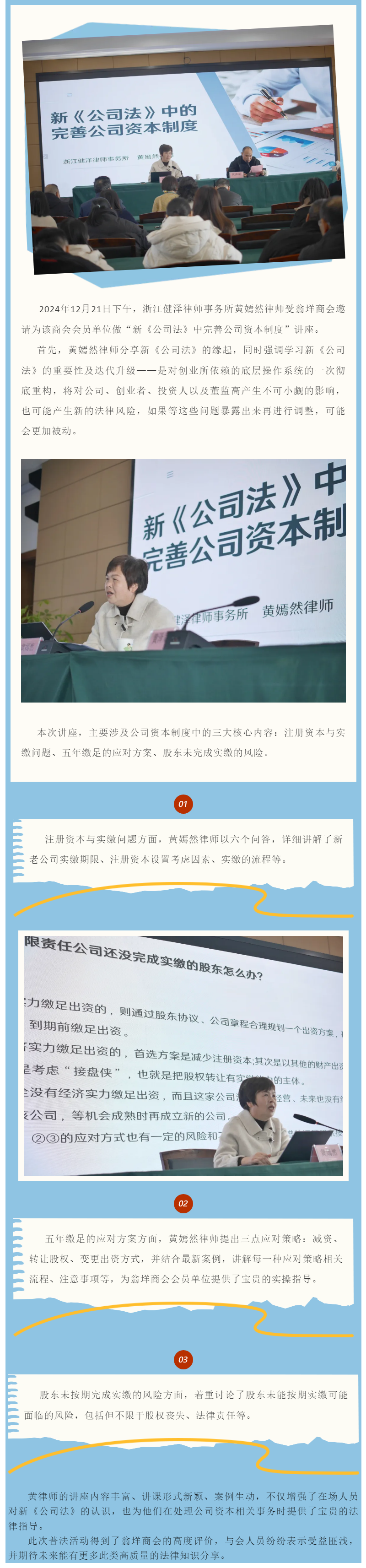 健泽所律师受邀为翁垟商会做“新《公司法》中完善公司资本制度”讲座